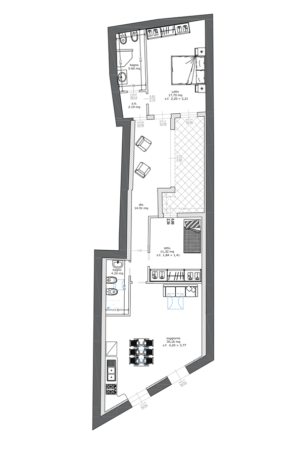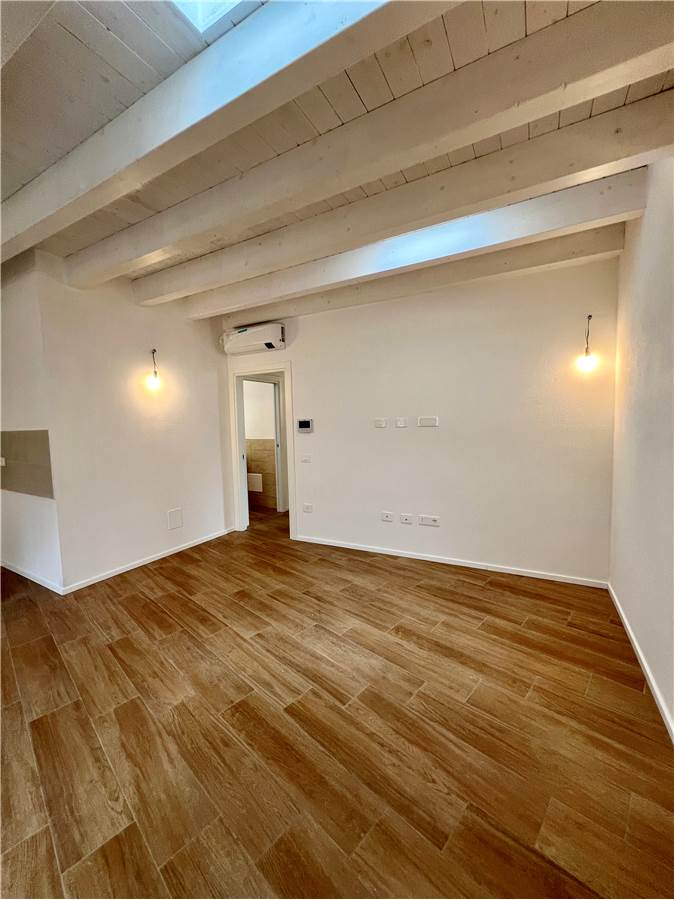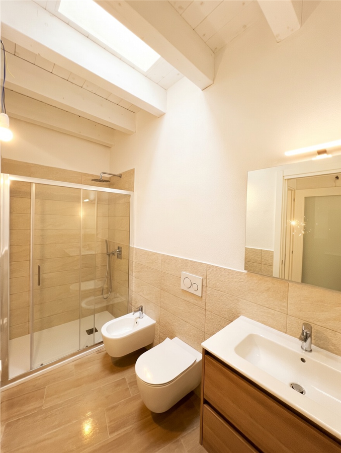 L’immobile è composto da soggiorno con angolo cottura, disimpegno, due camere da letto, primo bagno finestrato con Velux e secondo bagno en suite nella camera matrimoniale dotato di sistema di aerazione.