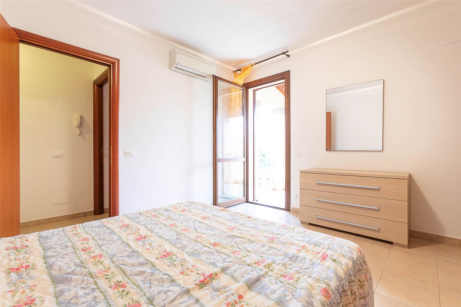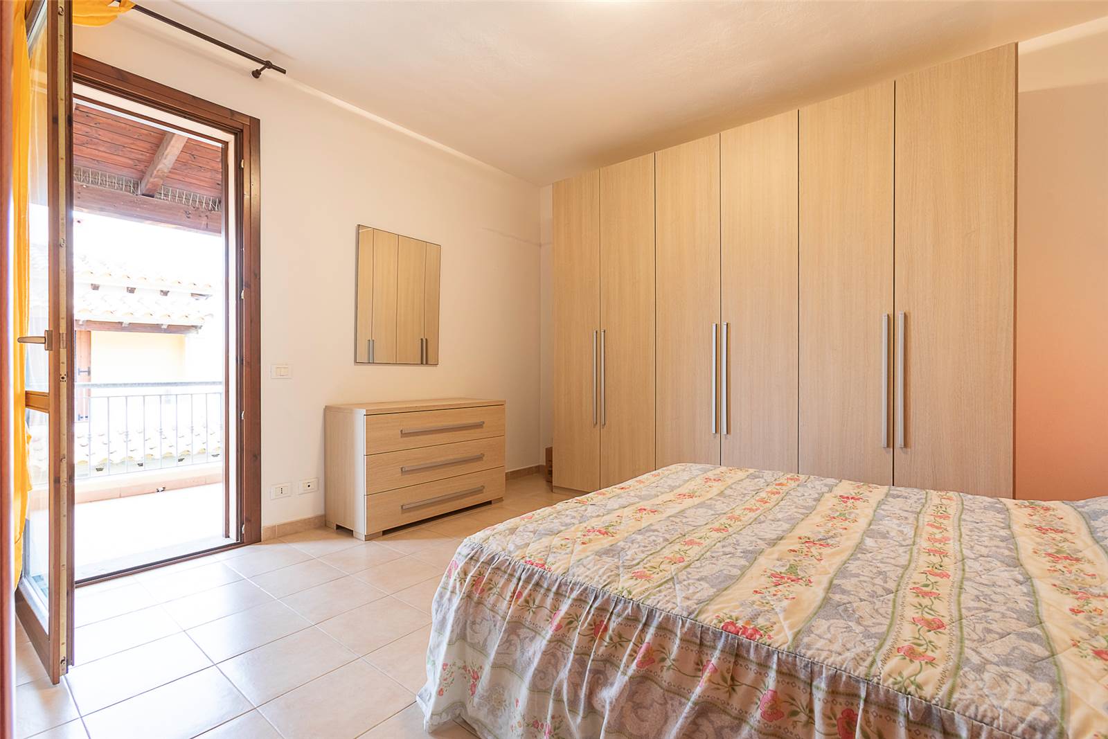 una camera matrimoniale con accesso a una grande veranda, perfetta per colazioni all’aperto o momenti di relax;