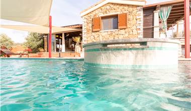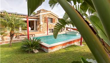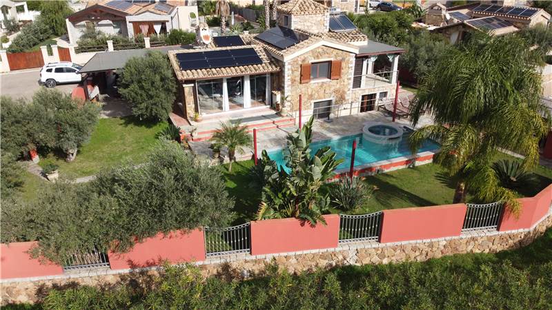 La villa al piano terra è composta da zona giorno con angolo cottura, due camere da letto, disimpegno, bagno con ampia doccia, sanitari sospesi e mobile lavabo, spaziosa veranda di oltre 26mq chiusa con delle scenografiche "VEPA" vetrate panoramiche scorrevoli che si affacciano sul curato giardino e piscina di 40 mq rivestita con uno splendido mosaico, dotata di nuoto contro corrente, vasca idromassaggio separata e riscaldata, luci led multi color, bordo vasca e gradini in granito locale.